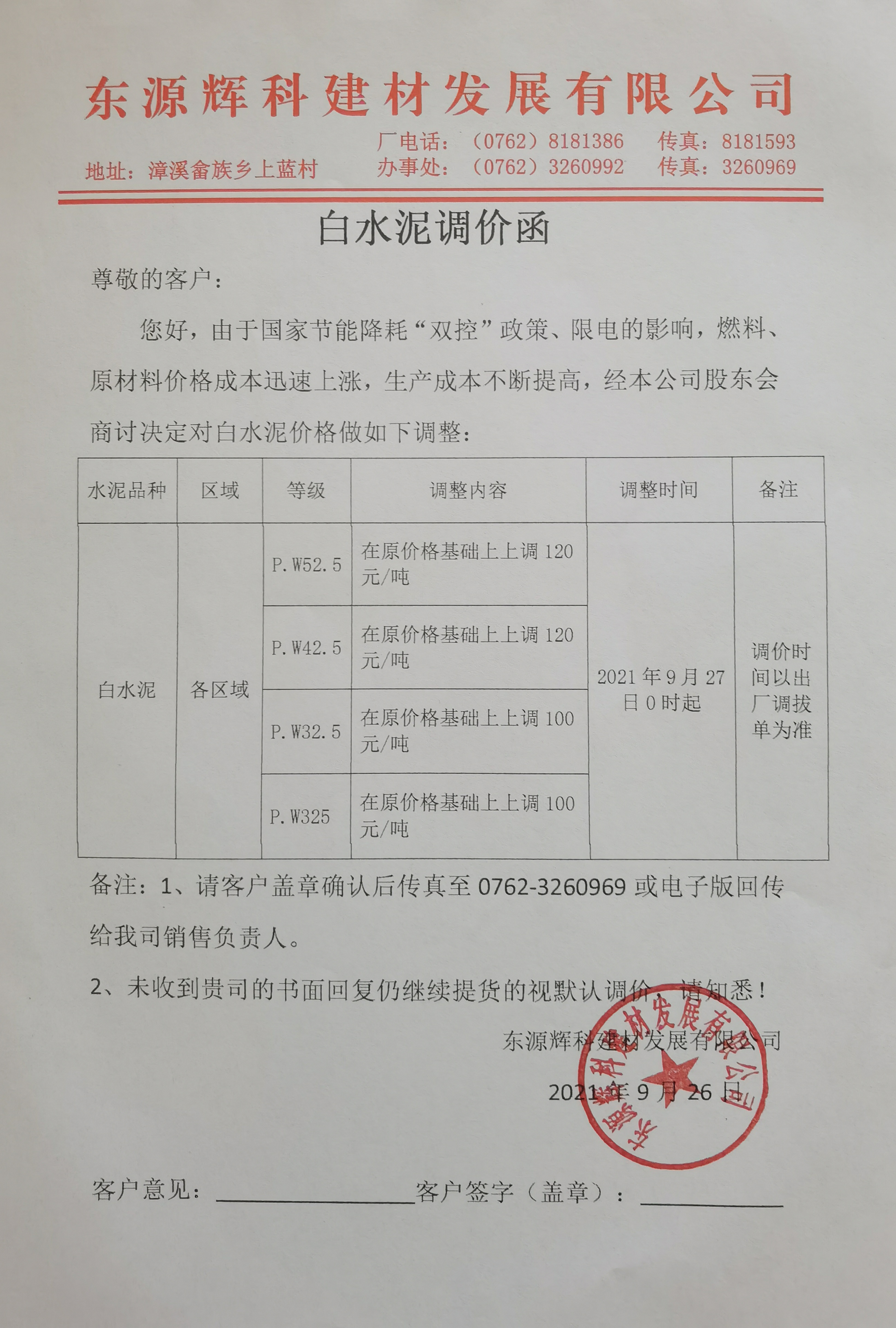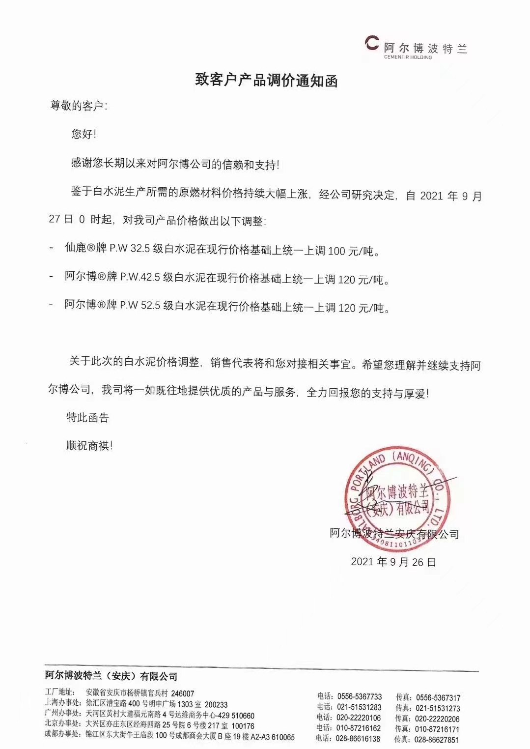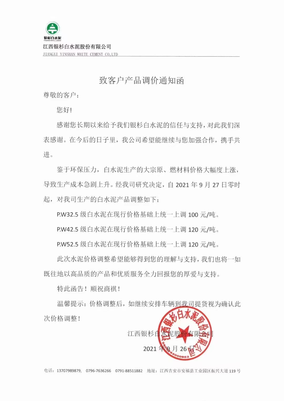 2021年9月26日白水泥價(jià)格大幅度上調(diào)